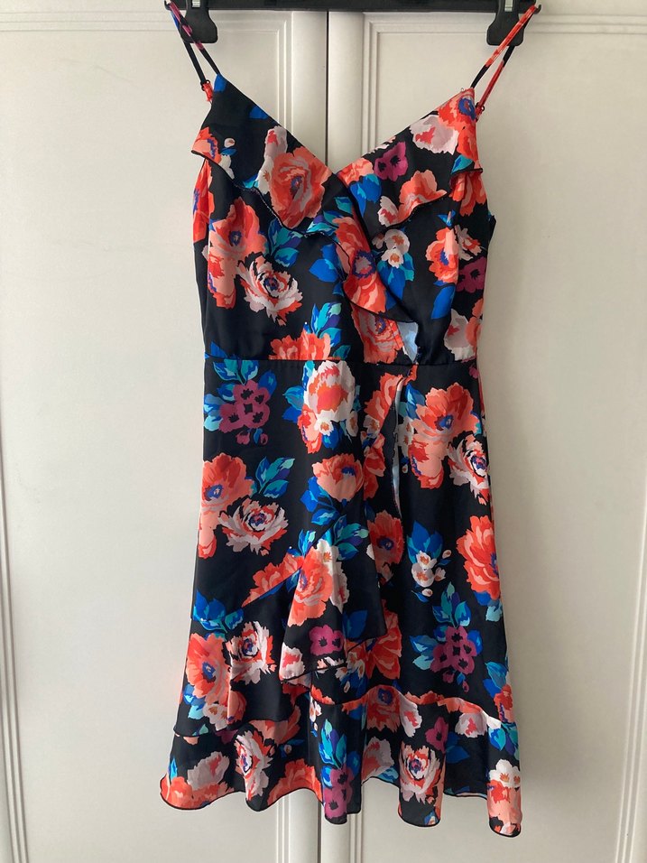Renkli çiçek desenli, ince askılı ve fırfırlı detaylara sahip, vücuda oturan mini elbise. Romantik akşamlar için ideal.