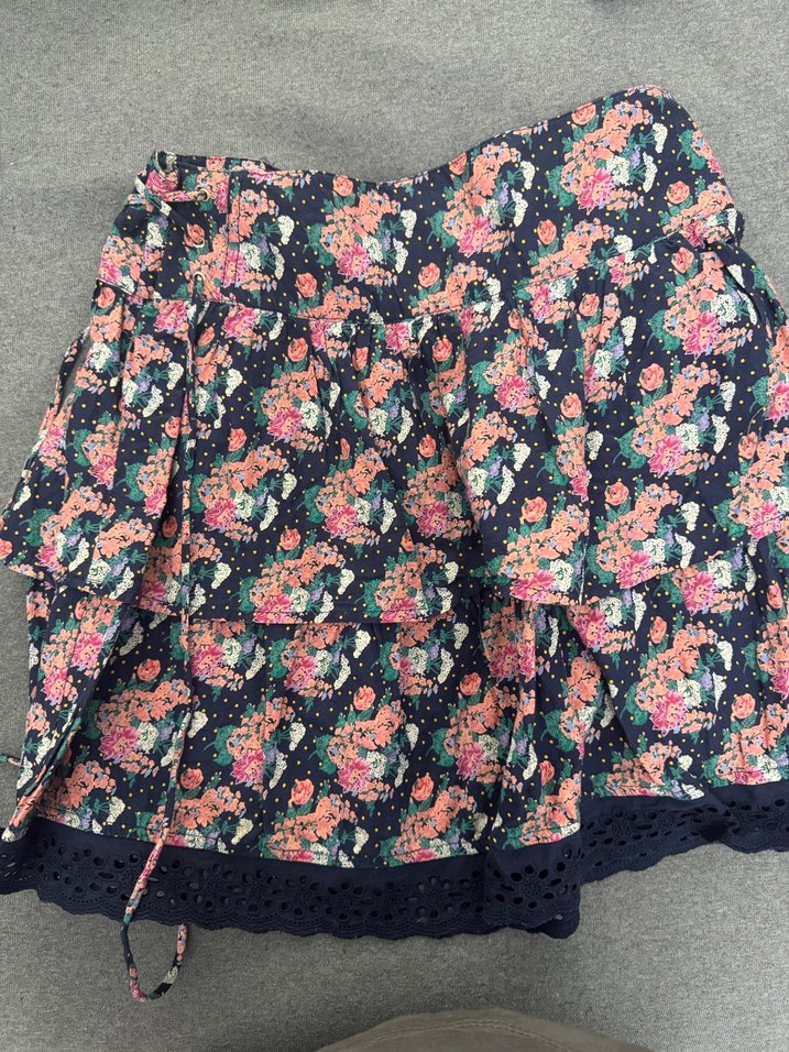 Bohem tarzda, yumuşak tekstil kumaştan yapılmış, fırfırlı ve koyu renkli çok renkli çiçek desenli, bol kesim mini etek.kenarındaki ipler sayesinde rahatlıkla kendi bedeninize göre ayarlayabilirsiniz
