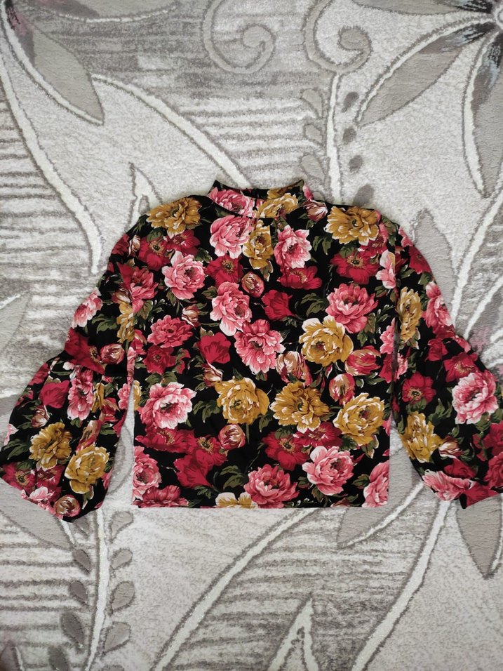 Uzun kollu, yüksek yakalı, koyu çok renkli çiçek desenli ve fırfırlı detaylı bol kesim bluz. Günlük kullanıma uygun rahat bohem tarzda.