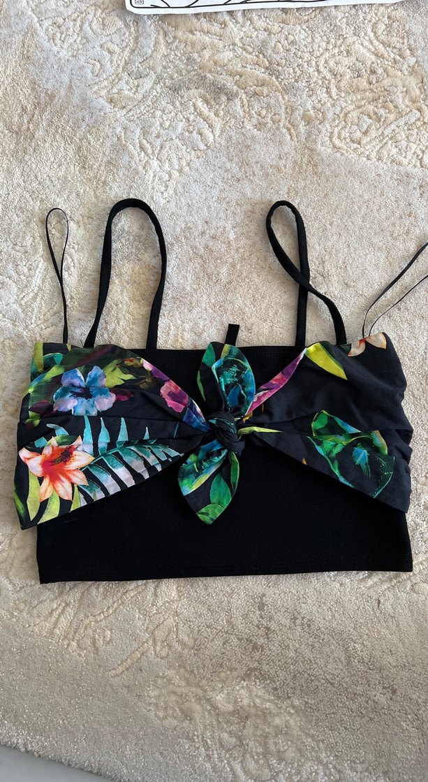 Kadın büstiyer, çiçek desenli ve fiyonklu, yumuşak sentetik kumaştan üretilmiştir. Bohem sokak stili ve günlük kullanım için uygundur.