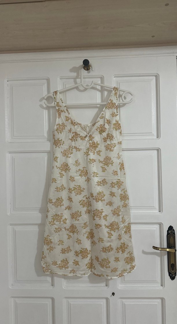 Çiçek desenli, beyaz renkli, V yakalı, kolsuz, midi boy ve bol kesimdir.