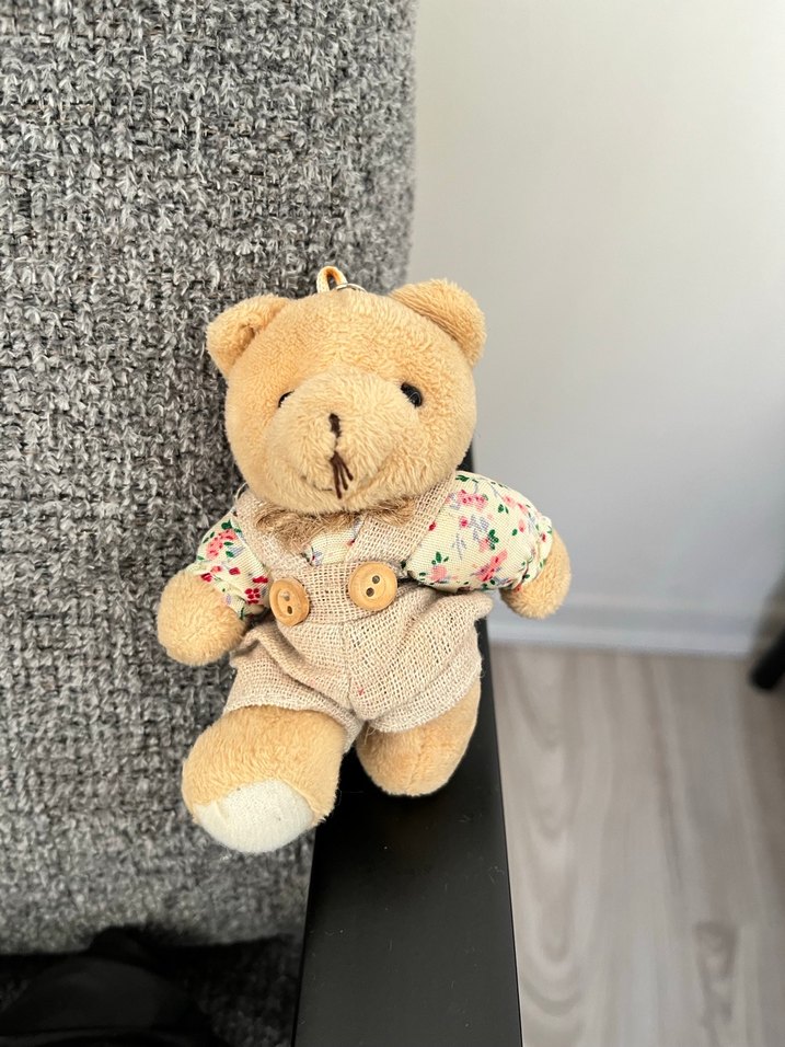 Çiçek desenli gömlek ve düğmeli bej tulum giymiş kahverengi peluş ayıcık. Yumuşak ve sarılmalık oyuncak. Burnundaki ipler çıktı ve üstteki ipinde renk değişimi var fotoğraflarda gözüküyor