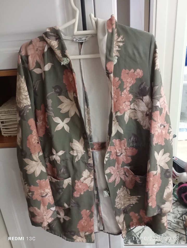 Gri çiçek desenli, düğmeli, uzun kollu, bol kesim midi ceket.Notlu yaka ve yumuşak sentetik kumaştan yapılmıştır.