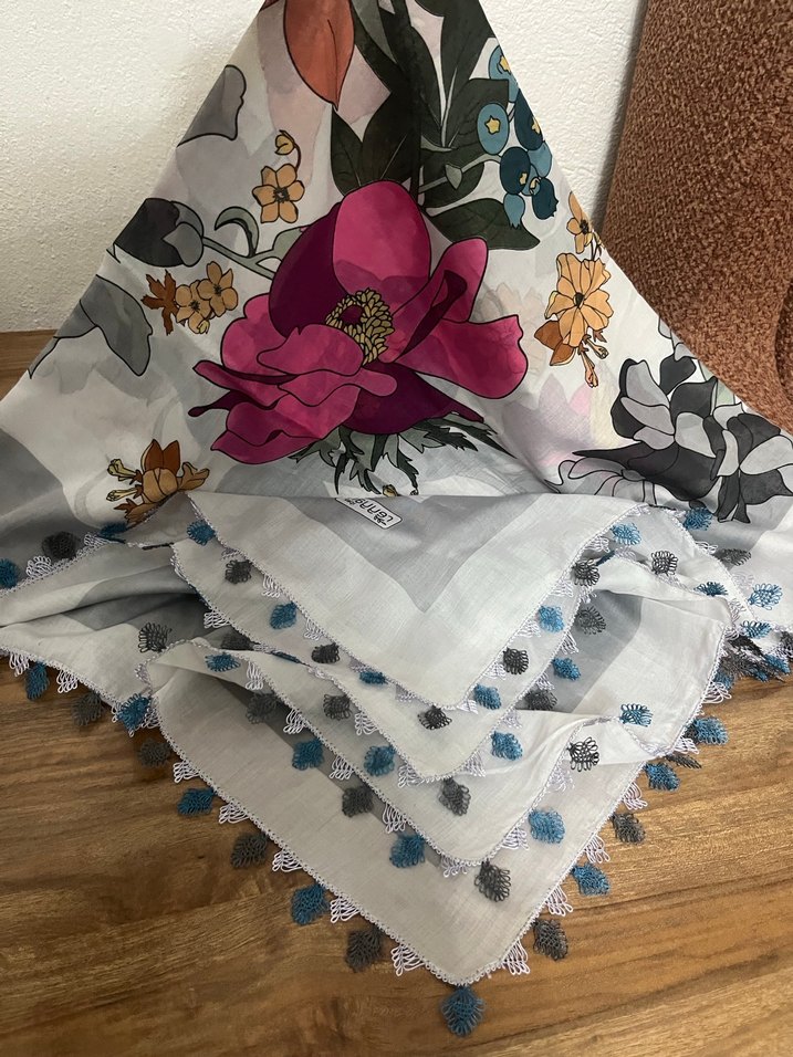 Kadınlar için tasarlanmış, gri renkli tekstil malzemeden yapılmış, bohem tarzda çiçek desenli ve fırfırlı kenar detaylı fular.
