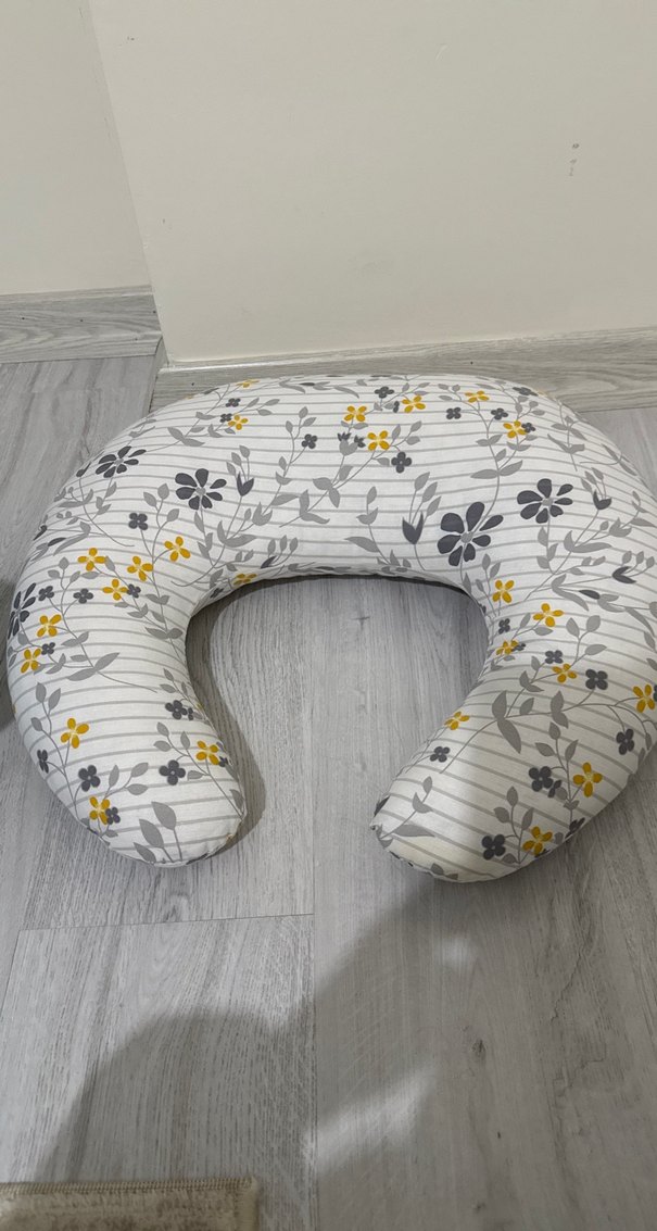 Sarı ve gri çiçek desenli gri hamile ve emzirme yastığı, anneye rahat destek sağlar. Hiç kullanmadım.