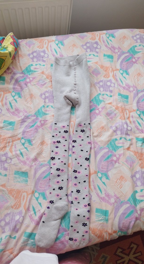 Yumuşak ve sıcak kumaştan, bağlama desenli ve küçük çiçek baskılı gri kız çocuk külotlu çorap. Rahat kullanım sağlar.