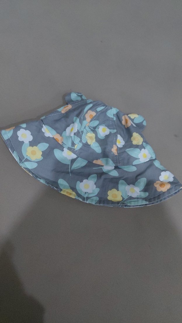 Sentetik kumaştan yapılmış, çiçek desenli ve fırfırlı gri kız çocuk şapkasıdır. Bohem ve retro tarzını yansıtır.