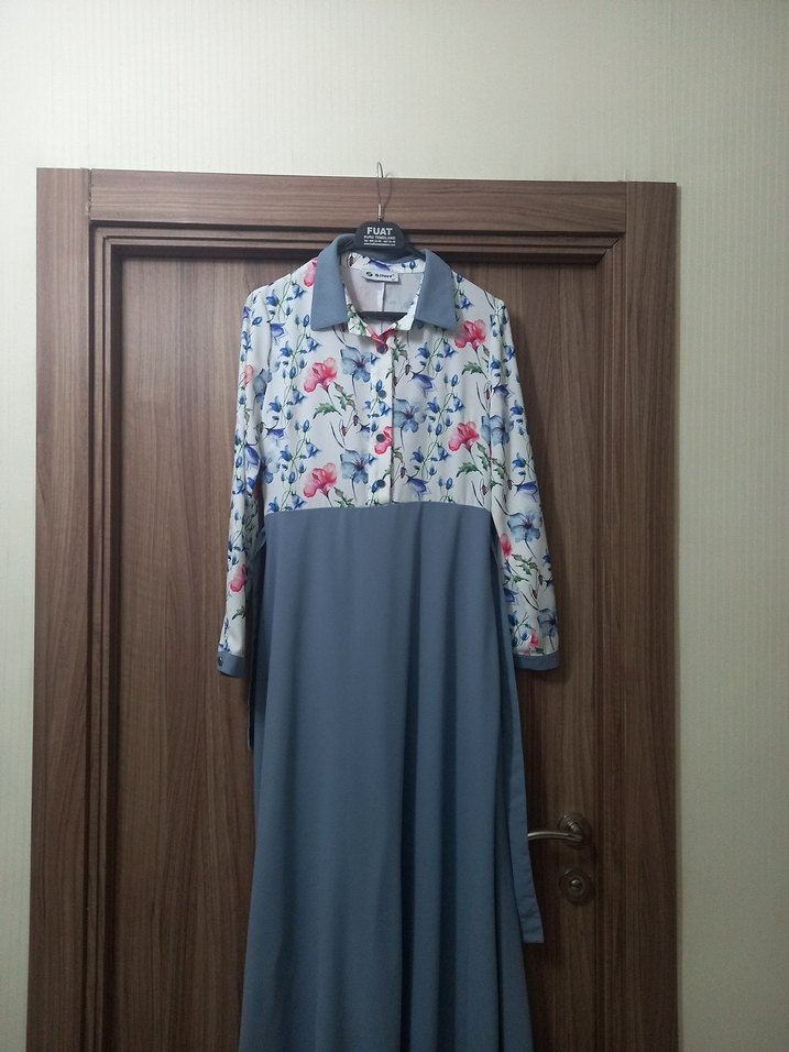 Gri uzun kollu elbise, yakalı ve düğmeli. Üst kısmı çiçek desenli, alt kısmı düz, rahat kesim.