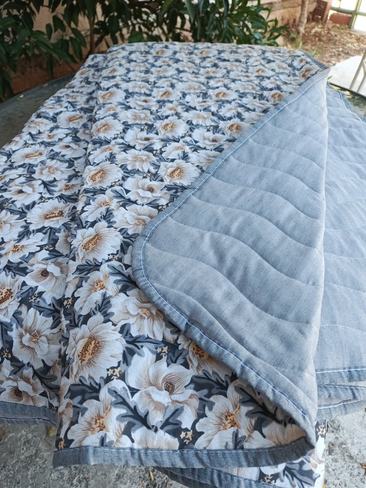 Bir tarafı çiçek desenli, diğer tarafı yumuşak ve kapitone gri kumaştan oluşan gri yatak örtüsü. çift kişilik ölçüler 230 * 200