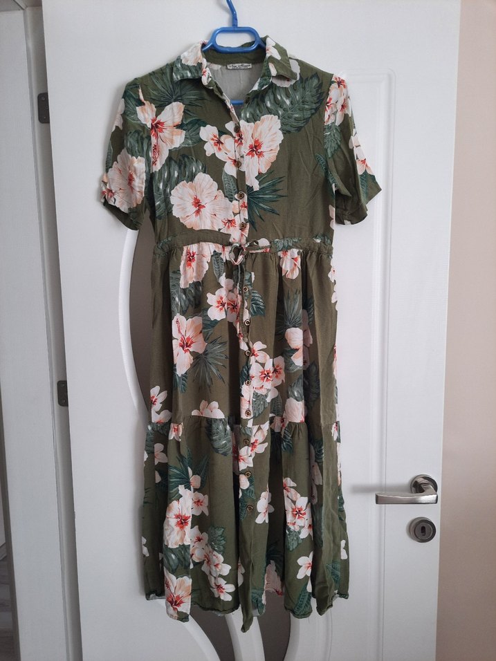 Haki renkli, çiçek desenli uzun elbise, bol kesim ve kısa kollu. Düğmeli ön kısmı ve yakalı tasarımıyla rahat bir kullanım sunar.
