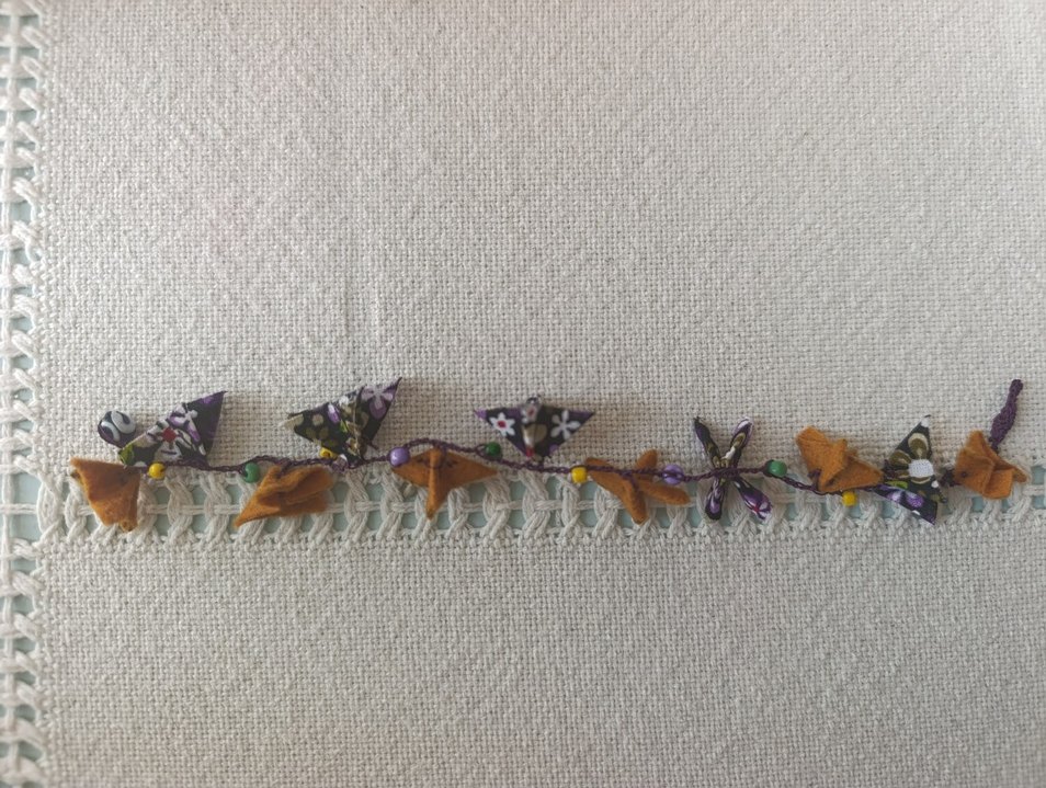 Çiçek desenli kumaş,keçe ve renkli boncuk kullanılarak zincir çekme ile birleştirilmiş otantik halhal. Ölçümleri üçüncü fotoğraftadır.