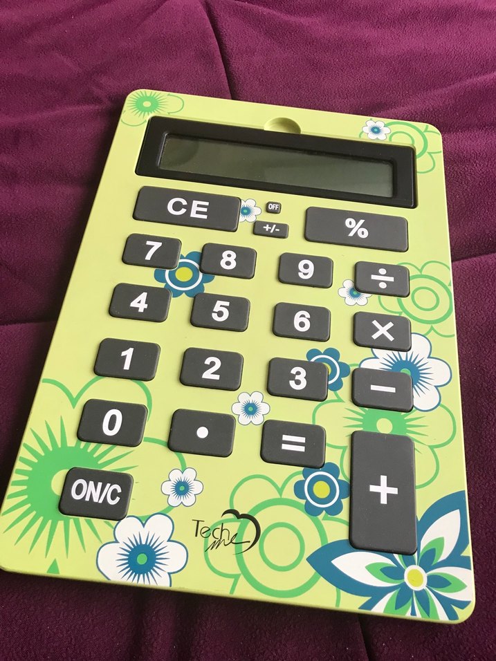 Sarı renkte, renkli çiçek desenli ve ON/C, +/-, CE tuşları bulunan hesap makinesi.
