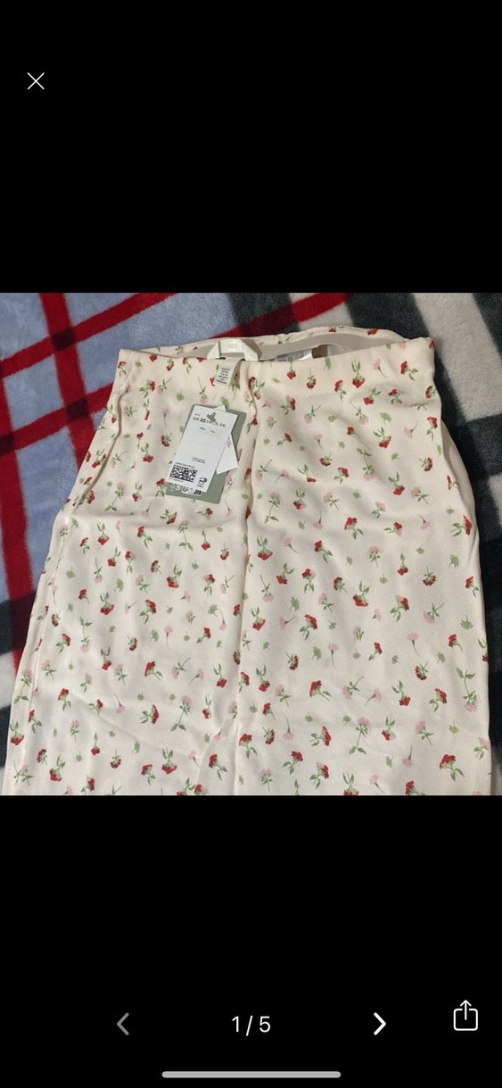 Çiçek desenli ve beyaz renkli hafif sentetik kumaştan yapılmış, rahat kesime sahip midi etek.