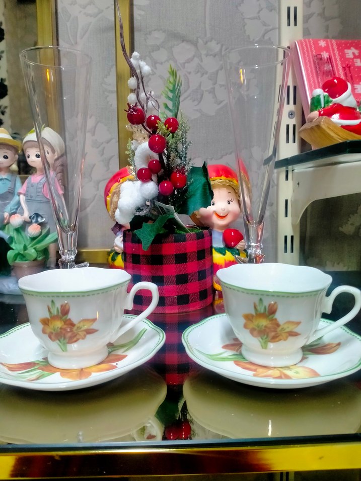 Çiçek desenli, beyaz renkte iki fincan ve yanında uyumlu iki tabak ile sıcak içecek servisi için uygundur. ☕