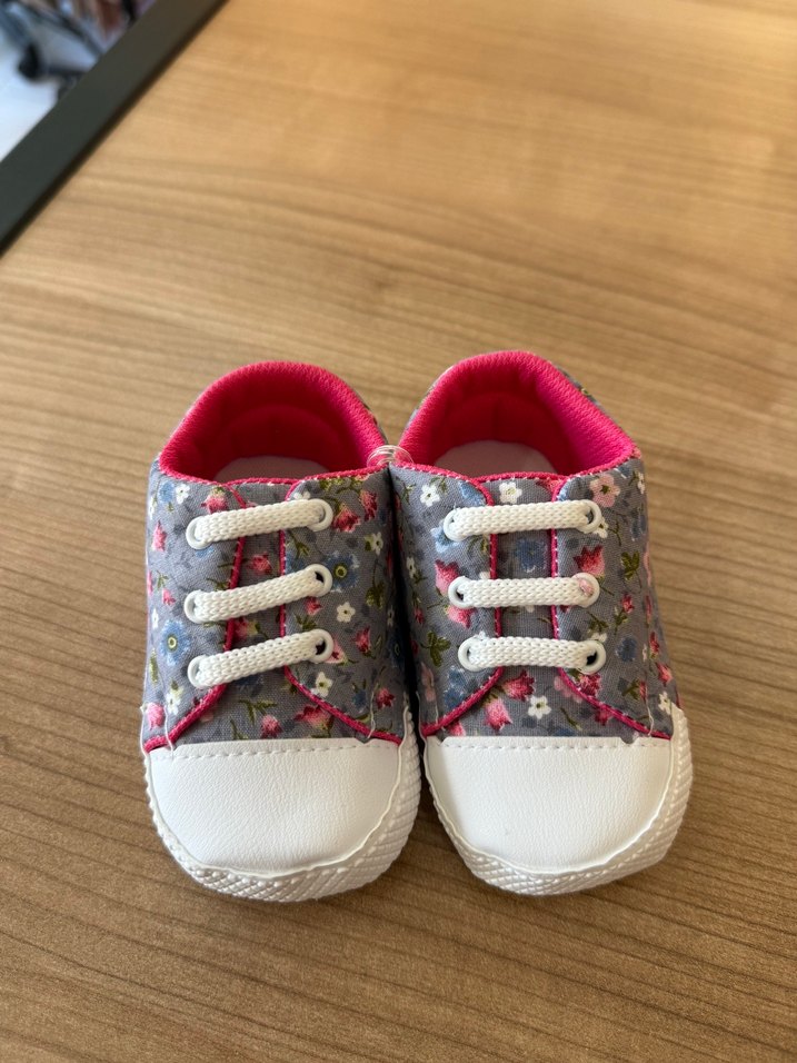 Gri tabanlı, çiçek desenli bohem tarzı kız çocuk ilk adım ayakkabısı. Kauçuk tabanlı, kolay giyilen cırt cırtlı ve içi canlı pembe renkte.