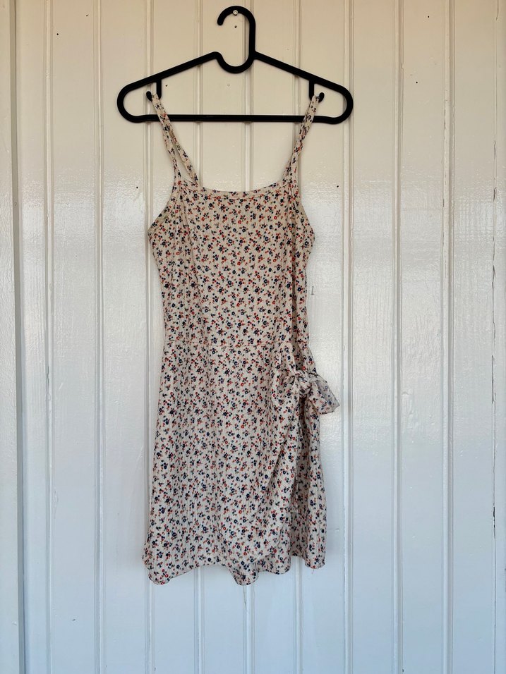 İnce askılı, çiçek desenli ve hafif kumaştan yapılmış, günlük kullanım için uygun, vücuda oturan midi elbise.