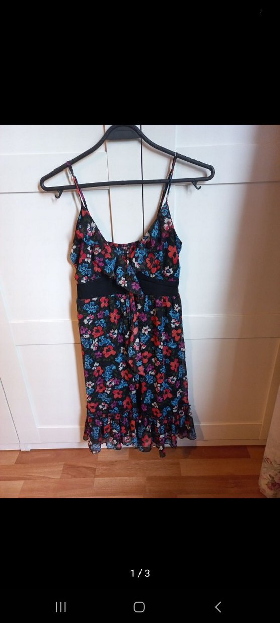 İnce askılı, straplez yaka ve fırfır detaylı, çiçek desenli koyu renkli mini elbise. Sentetik kumaştan, romantik akşamlar için uygundur.