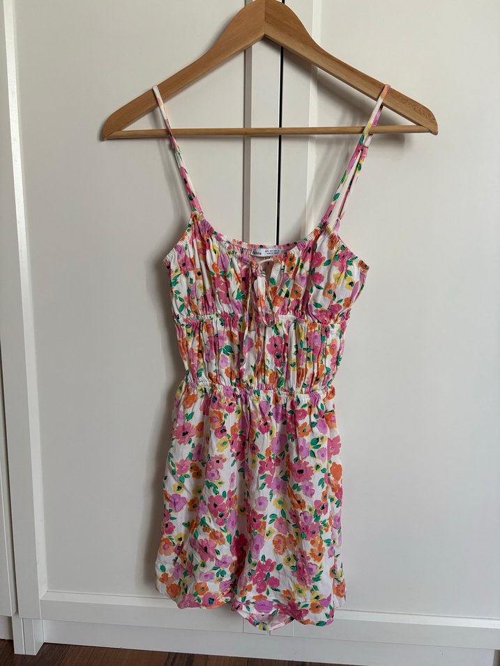 İnce askılı, fitted kesim mini elbise, pastel çiçek desenli yumuşak tekstil kumaştan, fırfır detaylı, günlük kullanım için uygundur.