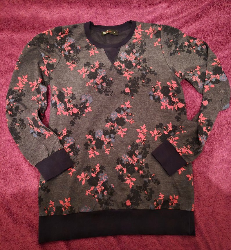 uzun kollu, yuvarlak yaka, çiçek desenli koyu gri kadın sweatshirt. Rahat kesimiyle günlük kullanıma uygundur.hic giyilmedi yenidir etiketsiz