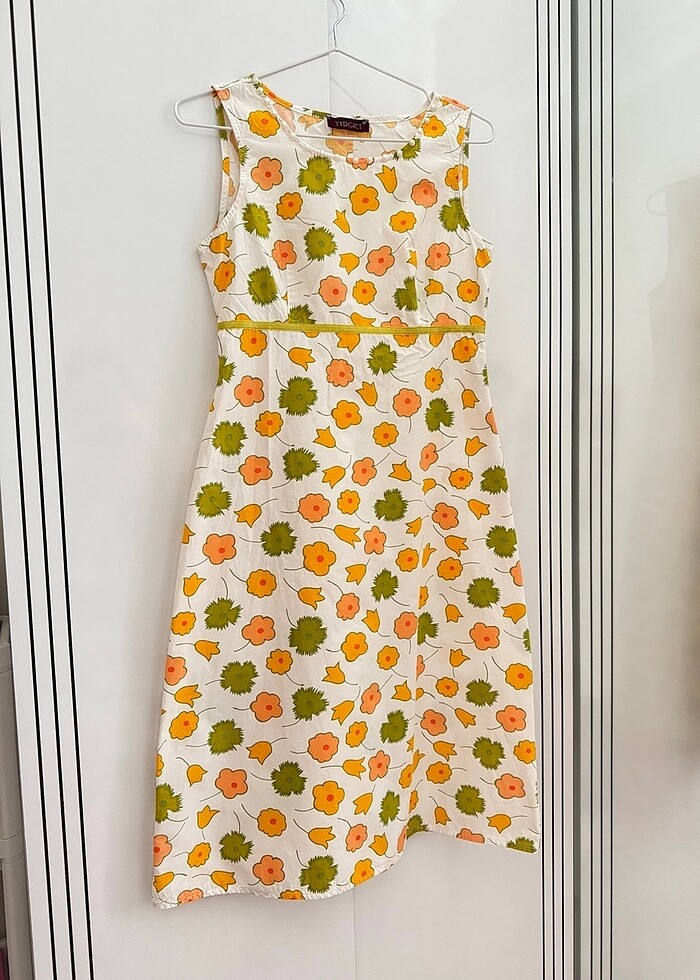 Cıvıl cıvıl yazlık bir elbise, üstümde gören herkes soruyor artık bedeni olmadığı için satıyorum. Esnemeyen pamuk kumaşı var. 38 beden fakat daha küçük bedenlere tavsiye ediyorum. İncilerinin bazılarında ve fermuarında hafif soyulmalar var fakat dibinden bakılmadıkça pek belli olmuyor (Görsellerde gösterildi). İç etiketi kesiktir.