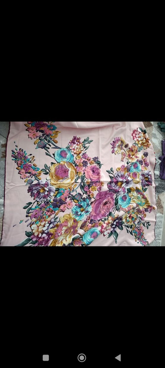 İpek görünümlü, pastel çok renkli çiçek desenli bohem tarzda, drapeli kadın fular.