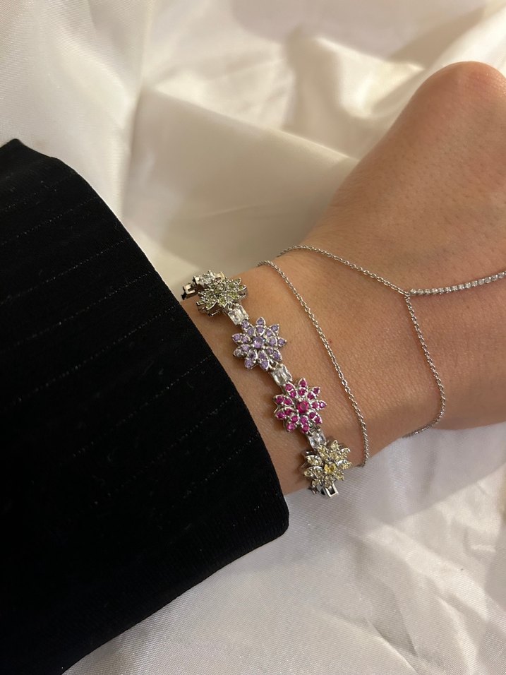 Çiçek desenli ve ışıltılı detaylara sahip kadın bileklik, çok renkli ve hafif tonlarda. Günlük kullanıma uygun, çağdaş ve klasik zarafeti yansıtır. ✨