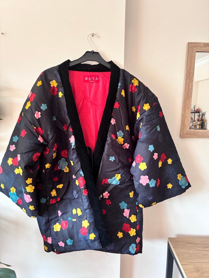Geleneksel sakura çiçeği desenli bol kesim kimono, lacivert siyah hareli pofuduk, kadife detaylı yakaya sahiptir. Uzun kollu, rahat bohem tarzda. Kadın erkek için uygundur. Japonyadan getirilmiştir. Lütfen iletişime geçiniz.
