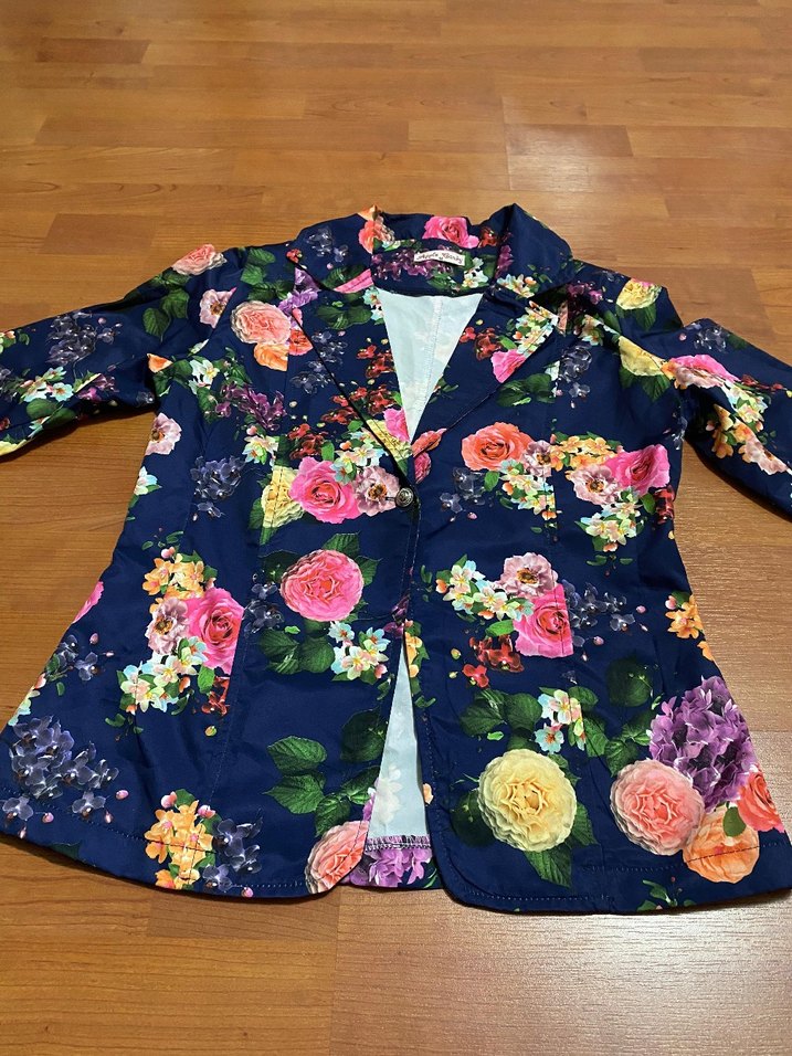 Dar kesim, çiçek desenli koyu renkli kadın blazer ceket. Uzun kollu, düğmeli ve kesik yakalıdır. Sentetik kumaştan, günlük kullanıma uygundur.
