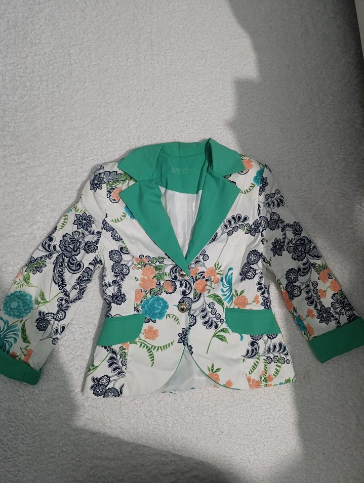 Çiçek desenli, düğmeli, yakalı, uzun kollu, sentetik kumaştan yapılmış, normal boyda kadın blazer ceket. Retro bohem tarzını yansıtır.