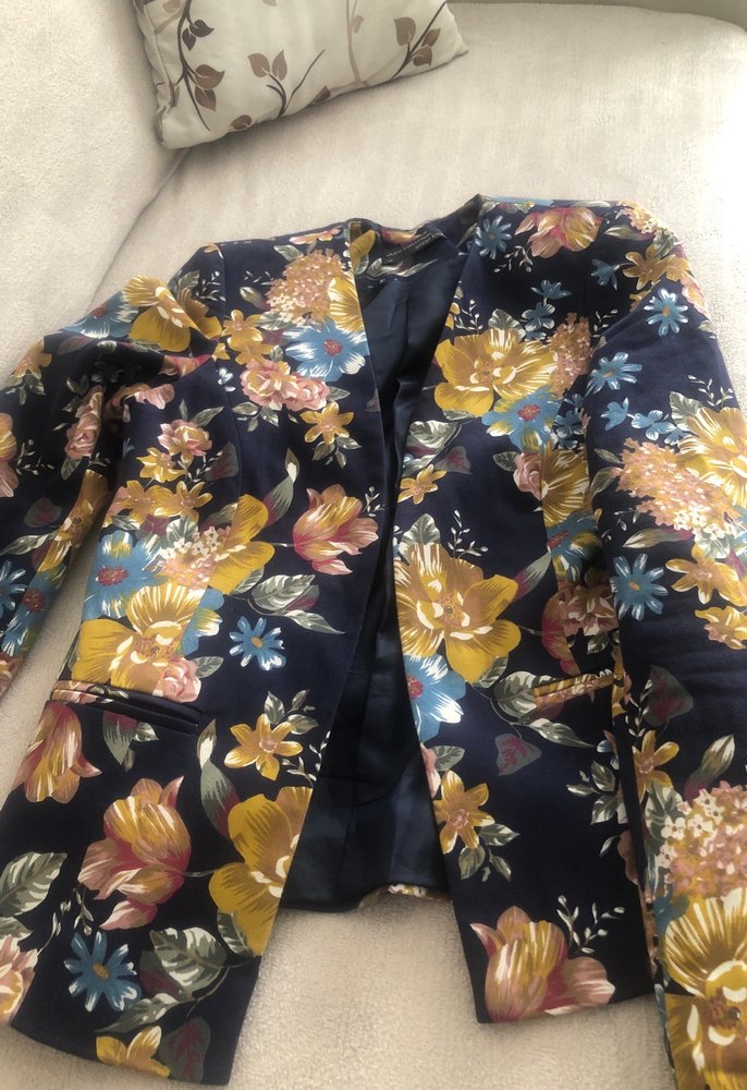 Bu dar kesim kadın blazer, koyu renkli çok renkli çiçek desenine sahip yumuşak sentetik kumaftan yapılmıştır. Çentikli yaka, uzun kollu ve düğmeli ön kısmı ile ofis için midi uzunluktadır.