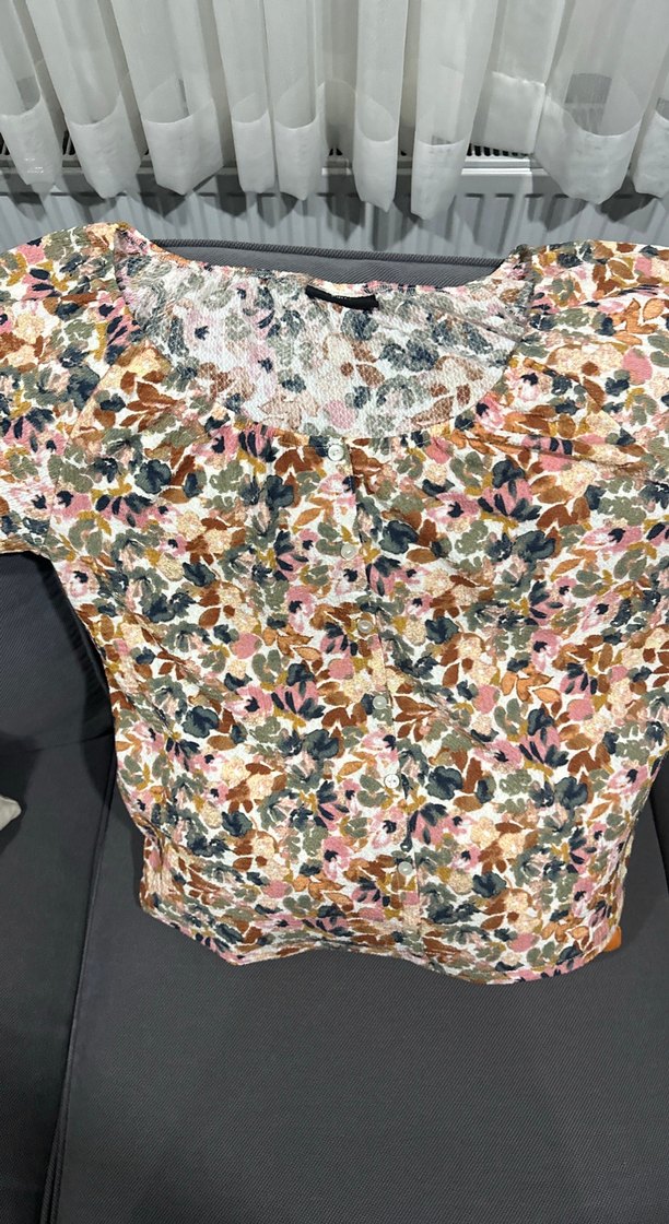 Renkli çiçek desenli, yumuşak kumaştan, bol kesim kadın bluz. Uzun kollu ve düğmeli, rahat bir model.