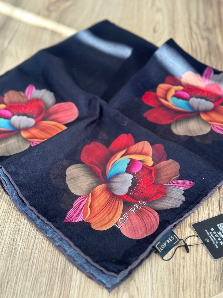 Kadınlar için drapeli tasarıma sahip, koyu zemin üzerinde çok renkli canlı çiçek desenleri bulunan, yumuşak sentetik kumaştan yapılmış fular.