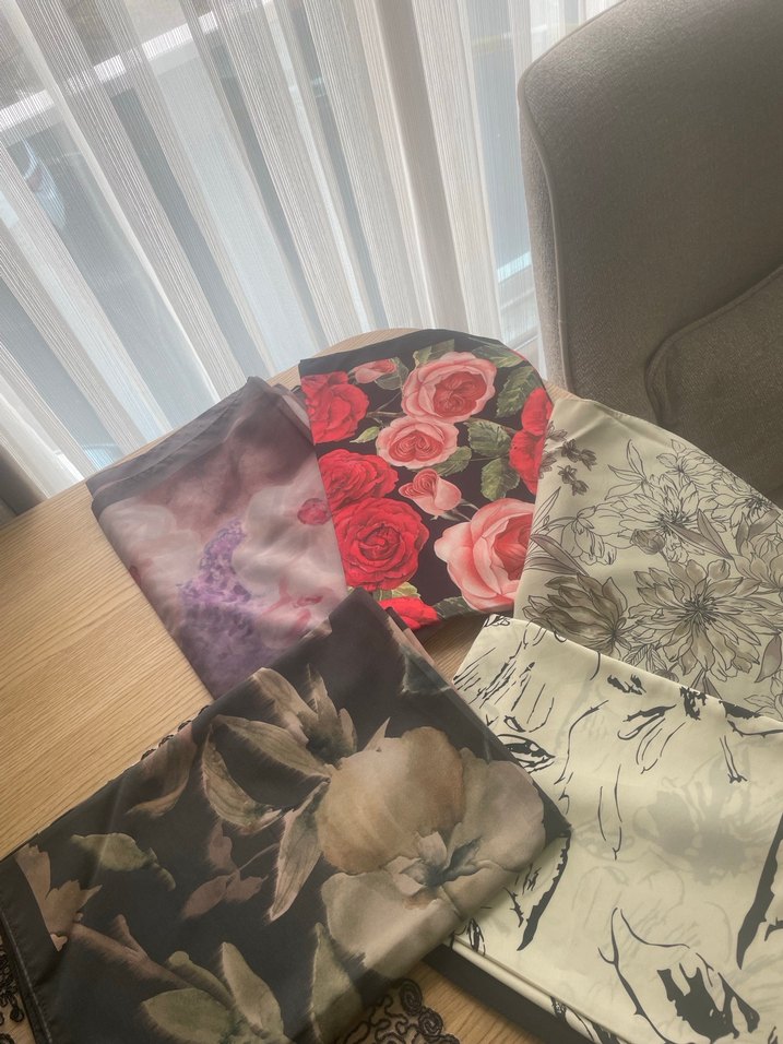 Kadınlar için, yumuşak sentetik kumaştan yapılmış, koyu tonlarda çok renkli çiçek desenlerine sahip, drapeli bohem tarzda şal.