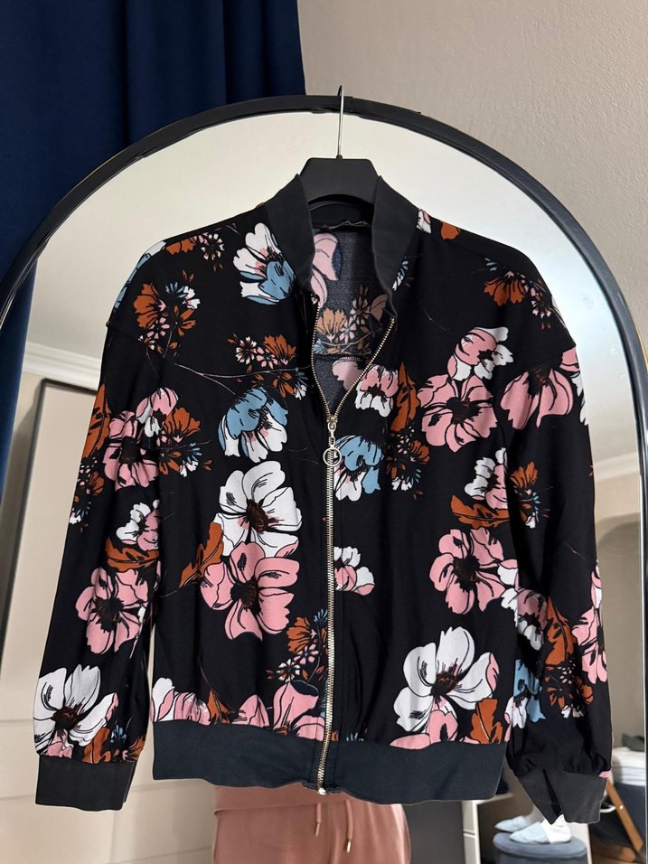 Çiçek desenli, bol kesim, uzun kollu kadın bomber ceket. Notlu yaka ve önden fermuarlı, sentetik kumaştan günlük kullanım için uygun.