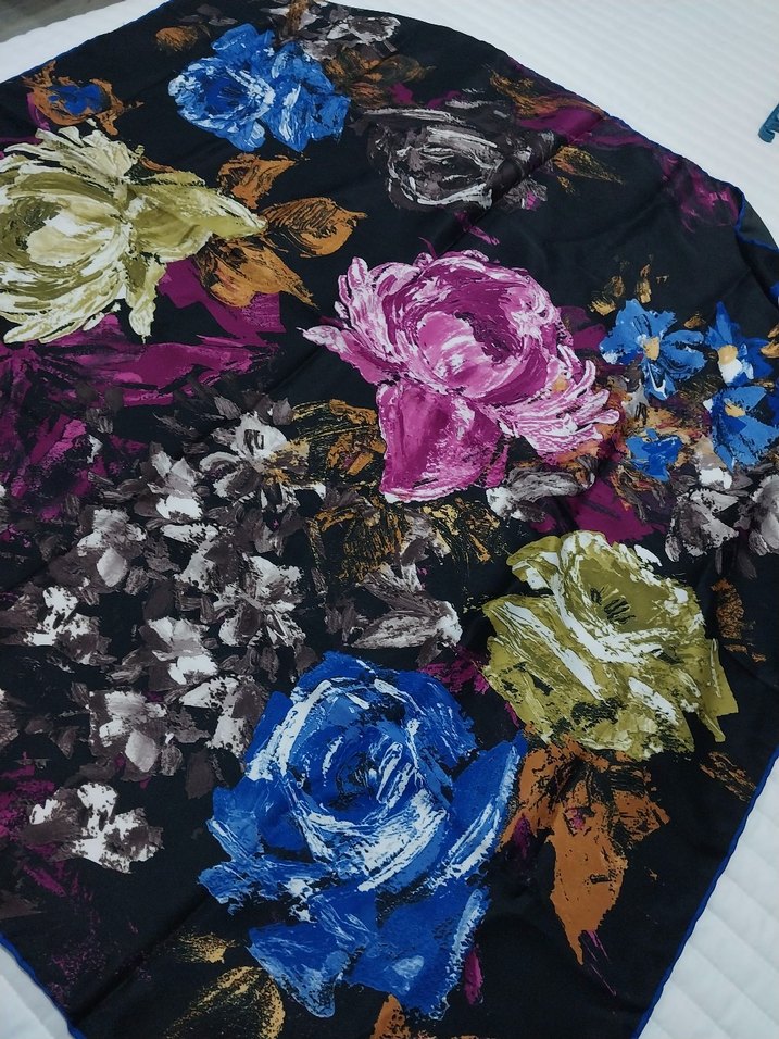 Kadınlar için koyu zemin üzerine canlı çok renkli çiçek desenleri bulunan, yumuşak sentetik kumaştan yapılmış, bohem tarzda drapeli şal.