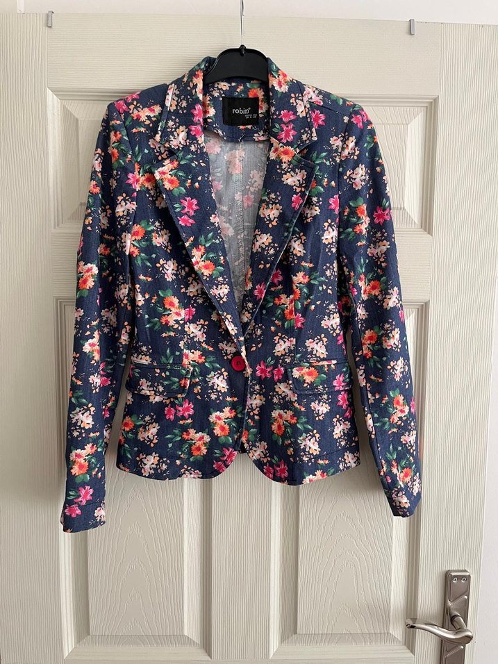 Çiçek desenli, düğmeli kadın denim ceket. Normal uzunlukta, uzun kollu ve regular fit kesim. Ofis ve günlük kullanıma uygun.