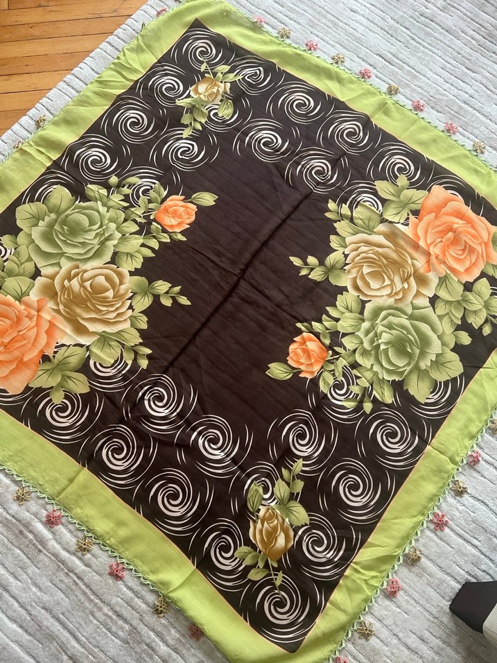 Kahverengi yeşilli çiçek desenli, kenarları işli olan bohem tarzda kadın fuları. Yumuşak tekstil ipek gibi çok güzel eşarp.