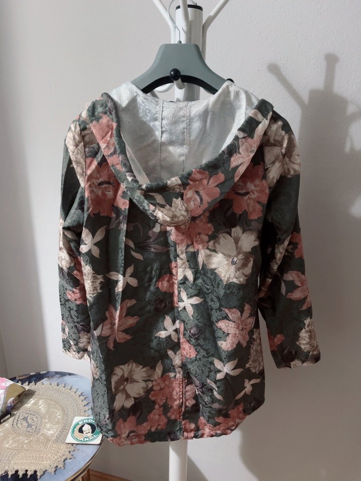 Kadın kimono, koyu renkli sentetik kumaş üzerine çiçek desenli, düğmeli, bol kesim, uzun kollu, normal boy midi uzunlukta bohem tarzda.