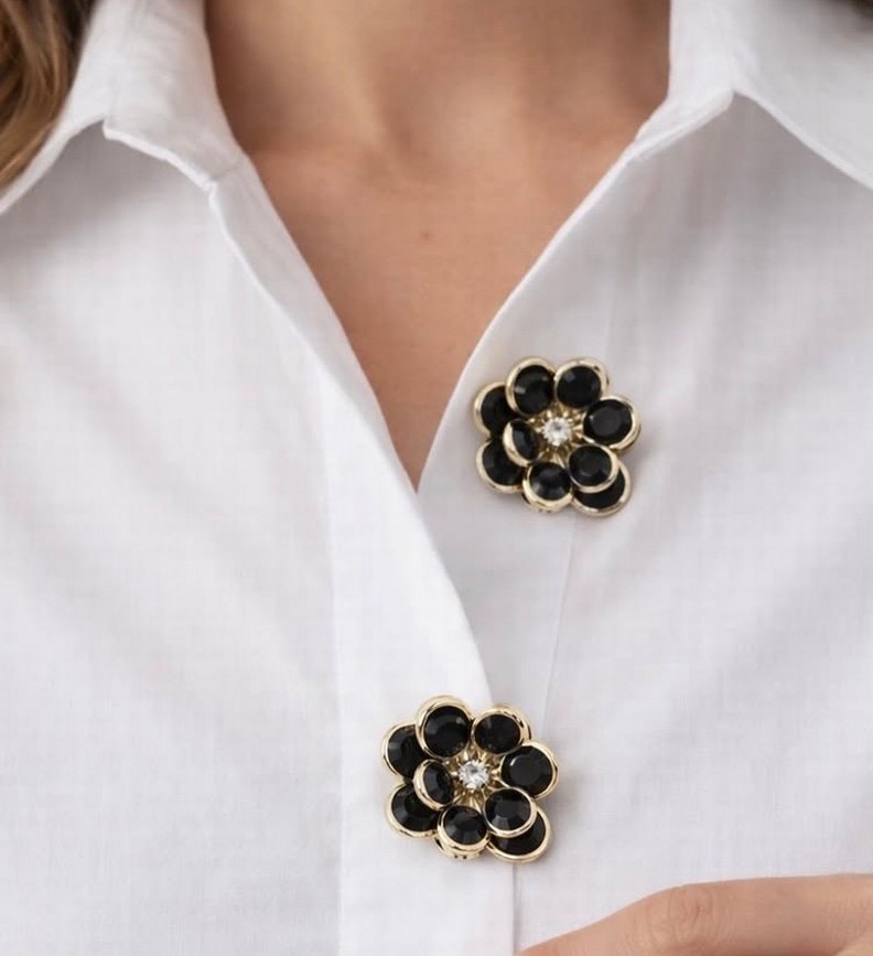 Düğmeli, çağdaş çiçek desenli siyah ve altın tonlarında kadın kol düğmeleri. Düğün kıyafetlerine klasik zarafet katar.