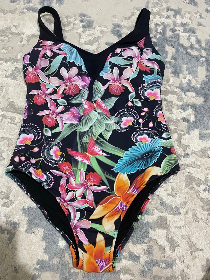 Çiçek desenli, ince askılı, dantelli ve vücuda oturan mini boy kadın mayo, plaj için uygun. 38 40 beden uyumlu