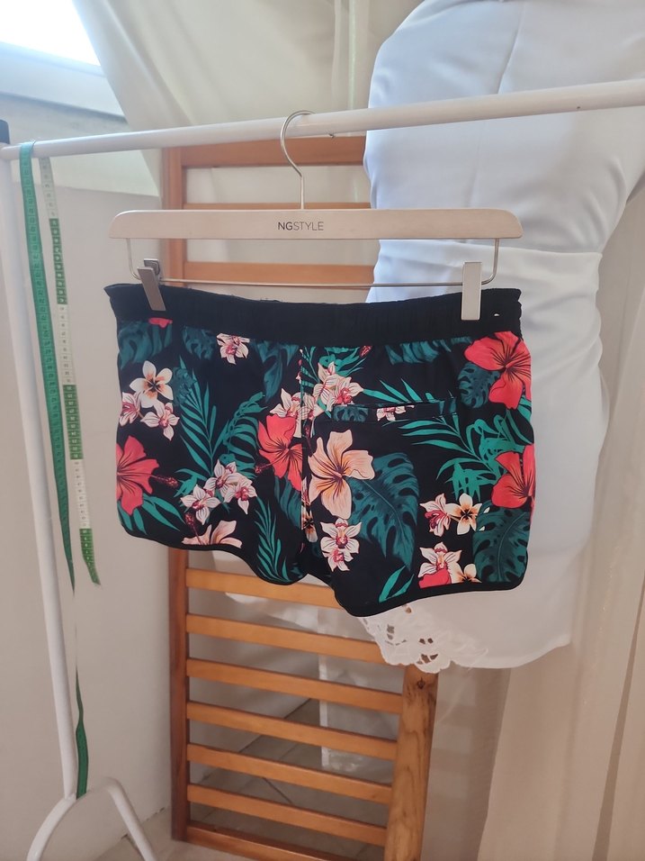 Decathlon marka deniz şortu birkaç defa kullanılmıştır uzunluğu 21 santim ve genişliği 41 santimdir Kadınlar için bol kesim, koyu renkli sentetik kumaş üzerine canlı çiçek desenli mini şort, plaj ve sokak stili için uygun.