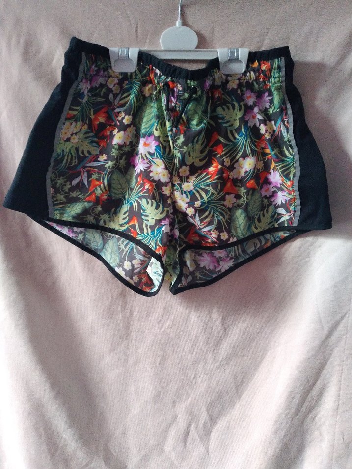 Renkli çiçek desenli, sentetik kumaştan yapılmış, bol kesim kadın mini deniz şortu. Açık hava ve sokak tarzına uygundur.