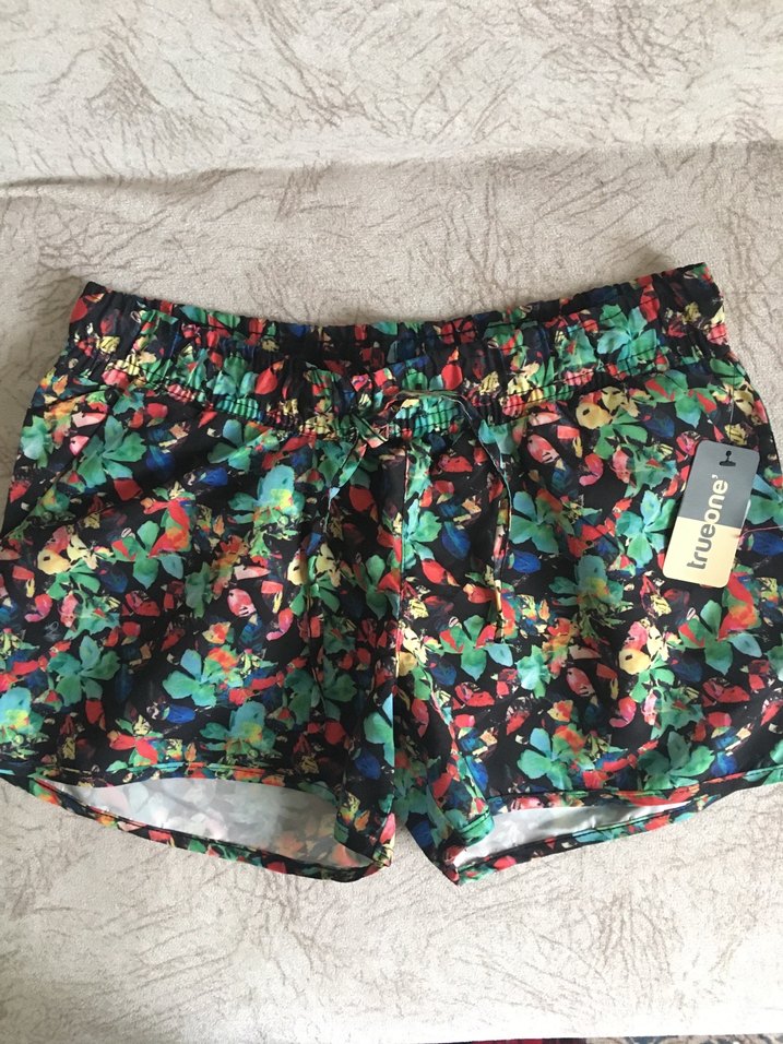 Kadınlar için bol kesim, sentetik kumaş üzerine renkli çiçek baskılı mini şort, dış mekan kullanımı için uygundur.