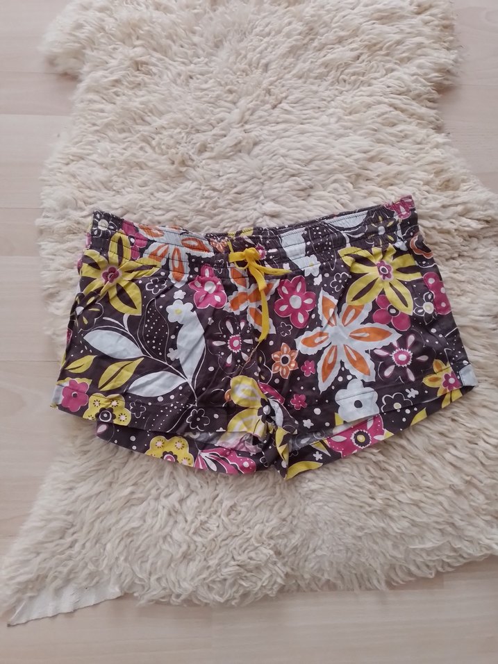 Renkli çiçek desenli, dantel detaylı, yumuşak sentetik kumaştan yapılmış, dar kesim kadın mini şort. Outdoor kullanıma uygundur.