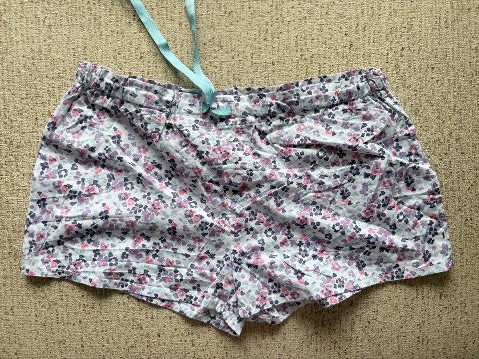 Yumuşak pamuktan, pastel çiçek desenli, düğmeli detaylı, bol kesim kadın mini şort. Bohem tarzda, günlük kullanıma uygun. 38 beden