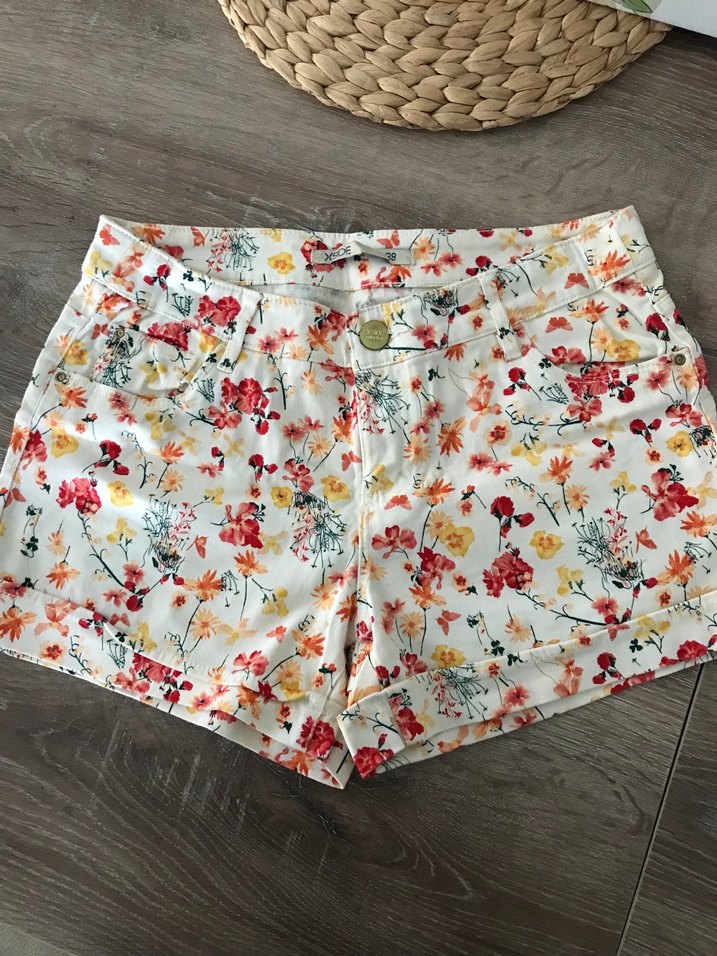 Renkli çiçek desenli, düğmeli kadın mini şort.