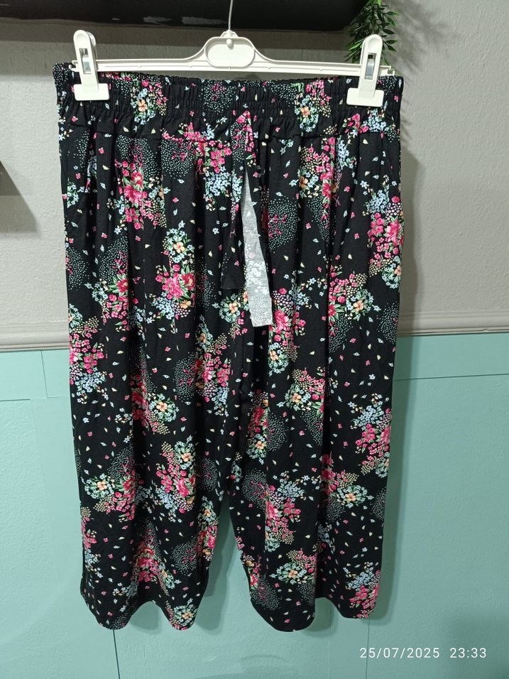 Kadınlar için kapri boy, bol kesim pantolon. Koyu zemin üzerine canlı çiçek deseni ve piliselerle bohem, rahat bir stil sunar. Günlük kullanıma uygundur. 10xl ama 46 beden sonrasina olur