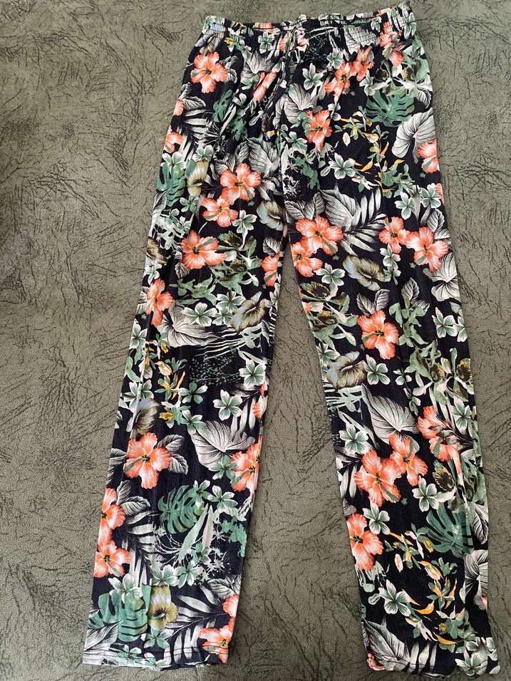 Çiçek desenli, elastik bel bantlı, bol kesim kadın kumaş pantolon, dış mekan rahat kullanıma uygundur.