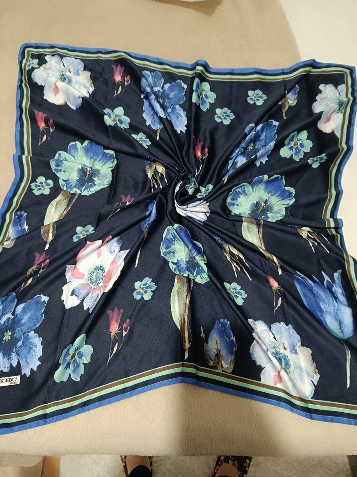 Kadın şal, yumuşak sentetik kumaş ve koyu renkli çoklu çiçek desenine sahip, drapeli bohem tarzda.