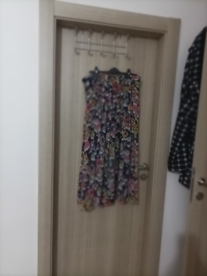 Çiçek desenli, çok renkli ve lacivert tonlarının bulunduğu yumuşak kumaştan kadın uzun eteği.